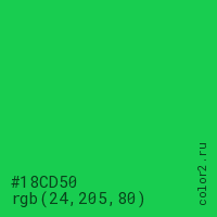 Цвет #18CD50 в цветовой модели RGB обозначается тремя октетами (24, 205, 80) в десятичном формате и #18CD50 в шестнадцатиричном (hex) формате, которые являются интенсивностью красного 24 (hex 18), интенсивность зелёного 205 (hex CD) и интенсивность синего 80 (hex 50).