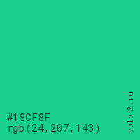 Цвет #18CF8F в цветовой модели RGB обозначается тремя октетами (24, 207, 143) в десятичном формате и #18CF8F в шестнадцатиричном (hex) формате, которые являются интенсивностью красного 24 (hex 18), интенсивность зелёного 207 (hex CF) и интенсивность синего 143 (hex 8F).