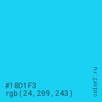 Цвет #18D1F3 в цветовой модели RGB обозначается тремя октетами (24, 209, 243) в десятичном формате и #18D1F3 в шестнадцатиричном (hex) формате, которые являются интенсивностью красного 24 (hex 18), интенсивность зелёного 209 (hex D1) и интенсивность синего 243 (hex F3).