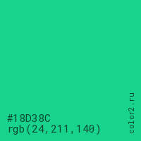 Цвет #18D38C в цветовой модели RGB обозначается тремя октетами (24, 211, 140) в десятичном формате и #18D38C в шестнадцатиричном (hex) формате, которые являются интенсивностью красного 24 (hex 18), интенсивность зелёного 211 (hex D3) и интенсивность синего 140 (hex 8C).