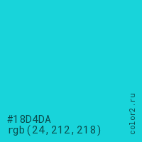 Цвет #18D4DA в цветовой модели RGB обозначается тремя октетами (24, 212, 218) в десятичном формате и #18D4DA в шестнадцатиричном (hex) формате, которые являются интенсивностью красного 24 (hex 18), интенсивность зелёного 212 (hex D4) и интенсивность синего 218 (hex DA).