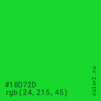 Цвет #18D72D в цветовой модели RGB обозначается тремя октетами (24, 215, 45) в десятичном формате и #18D72D в шестнадцатиричном (hex) формате, которые являются интенсивностью красного 24 (hex 18), интенсивность зелёного 215 (hex D7) и интенсивность синего 45 (hex 2D).
