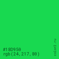 Цвет #18D950 в цветовой модели RGB обозначается тремя октетами (24, 217, 80) в десятичном формате и #18D950 в шестнадцатиричном (hex) формате, которые являются интенсивностью красного 24 (hex 18), интенсивность зелёного 217 (hex D9) и интенсивность синего 80 (hex 50).