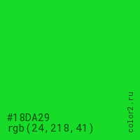 Цвет #18DA29 в цветовой модели RGB обозначается тремя октетами (24, 218, 41) в десятичном формате и #18DA29 в шестнадцатиричном (hex) формате, которые являются интенсивностью красного 24 (hex 18), интенсивность зелёного 218 (hex DA) и интенсивность синего 41 (hex 29).