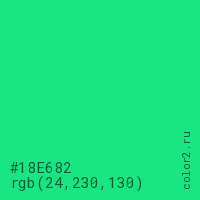 Цвет #18E682 в цветовой модели RGB обозначается тремя октетами (24, 230, 130) в десятичном формате и #18E682 в шестнадцатиричном (hex) формате, которые являются интенсивностью красного 24 (hex 18), интенсивность зелёного 230 (hex E6) и интенсивность синего 130 (hex 82).