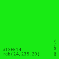 Цвет #18EB14 в цветовой модели RGB обозначается тремя октетами (24, 235, 20) в десятичном формате и #18EB14 в шестнадцатиричном (hex) формате, которые являются интенсивностью красного 24 (hex 18), интенсивность зелёного 235 (hex EB) и интенсивность синего 20 (hex 14).