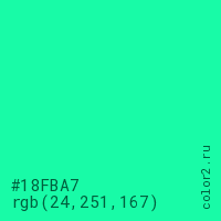 Цвет #18FBA7 в цветовой модели RGB обозначается тремя октетами (24, 251, 167) в десятичном формате и #18FBA7 в шестнадцатиричном (hex) формате, которые являются интенсивностью красного 24 (hex 18), интенсивность зелёного 251 (hex FB) и интенсивность синего 167 (hex A7).