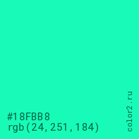 Цвет #18FBB8 в цветовой модели RGB обозначается тремя октетами (24, 251, 184) в десятичном формате и #18FBB8 в шестнадцатиричном (hex) формате, которые являются интенсивностью красного 24 (hex 18), интенсивность зелёного 251 (hex FB) и интенсивность синего 184 (hex B8).