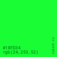 Цвет #18FD34 в цветовой модели RGB обозначается тремя октетами (24, 253, 52) в десятичном формате и #18FD34 в шестнадцатиричном (hex) формате, которые являются интенсивностью красного 24 (hex 18), интенсивность зелёного 253 (hex FD) и интенсивность синего 52 (hex 34).
