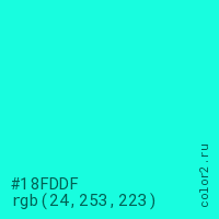 Цвет #18FDDF в цветовой модели RGB обозначается тремя октетами (24, 253, 223) в десятичном формате и #18FDDF в шестнадцатиричном (hex) формате, которые являются интенсивностью красного 24 (hex 18), интенсивность зелёного 253 (hex FD) и интенсивность синего 223 (hex DF).