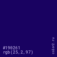Цвет #190261 в цветовой модели RGB обозначается тремя октетами (25, 2, 97) в десятичном формате и #190261 в шестнадцатиричном (hex) формате, которые являются интенсивностью красного 25 (hex 19), интенсивность зелёного 2 (hex 02) и интенсивность синего 97 (hex 61).