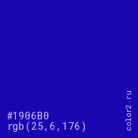 Цвет #1906B0 в цветовой модели RGB обозначается тремя октетами (25, 6, 176) в десятичном формате и #1906B0 в шестнадцатиричном (hex) формате, которые являются интенсивностью красного 25 (hex 19), интенсивность зелёного 6 (hex 06) и интенсивность синего 176 (hex B0).