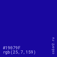 Цвет #19079F в цветовой модели RGB обозначается тремя октетами (25, 7, 159) в десятичном формате и #19079F в шестнадцатиричном (hex) формате, которые являются интенсивностью красного 25 (hex 19), интенсивность зелёного 7 (hex 07) и интенсивность синего 159 (hex 9F).