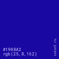 Цвет #1908A2 в цветовой модели RGB обозначается тремя октетами (25, 8, 162) в десятичном формате и #1908A2 в шестнадцатиричном (hex) формате, которые являются интенсивностью красного 25 (hex 19), интенсивность зелёного 8 (hex 08) и интенсивность синего 162 (hex A2).