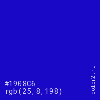 Цвет #1908C6 в цветовой модели RGB обозначается тремя октетами (25, 8, 198) в десятичном формате и #1908C6 в шестнадцатиричном (hex) формате, которые являются интенсивностью красного 25 (hex 19), интенсивность зелёного 8 (hex 08) и интенсивность синего 198 (hex C6).