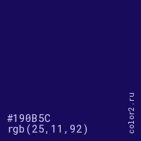 Цвет #190B5C в цветовой модели RGB обозначается тремя октетами (25, 11, 92) в десятичном формате и #190B5C в шестнадцатиричном (hex) формате, которые являются интенсивностью красного 25 (hex 19), интенсивность зелёного 11 (hex 0B) и интенсивность синего 92 (hex 5C).
