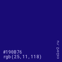 Цвет #190B76 в цветовой модели RGB обозначается тремя октетами (25, 11, 118) в десятичном формате и #190B76 в шестнадцатиричном (hex) формате, которые являются интенсивностью красного 25 (hex 19), интенсивность зелёного 11 (hex 0B) и интенсивность синего 118 (hex 76).
