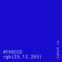 Цвет #190CCD в цветовой модели RGB обозначается тремя октетами (25, 12, 205) в десятичном формате и #190CCD в шестнадцатиричном (hex) формате, которые являются интенсивностью красного 25 (hex 19), интенсивность зелёного 12 (hex 0C) и интенсивность синего 205 (hex CD).