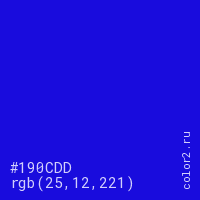 Цвет #190CDD в цветовой модели RGB обозначается тремя октетами (25, 12, 221) в десятичном формате и #190CDD в шестнадцатиричном (hex) формате, которые являются интенсивностью красного 25 (hex 19), интенсивность зелёного 12 (hex 0C) и интенсивность синего 221 (hex DD).