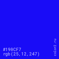 Цвет #190CF7 в цветовой модели RGB обозначается тремя октетами (25, 12, 247) в десятичном формате и #190CF7 в шестнадцатиричном (hex) формате, которые являются интенсивностью красного 25 (hex 19), интенсивность зелёного 12 (hex 0C) и интенсивность синего 247 (hex F7).