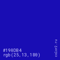 Цвет #190DB4 в цветовой модели RGB обозначается тремя октетами (25, 13, 180) в десятичном формате и #190DB4 в шестнадцатиричном (hex) формате, которые являются интенсивностью красного 25 (hex 19), интенсивность зелёного 13 (hex 0D) и интенсивность синего 180 (hex B4).