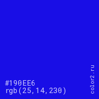 Цвет #190EE6 в цветовой модели RGB обозначается тремя октетами (25, 14, 230) в десятичном формате и #190EE6 в шестнадцатиричном (hex) формате, которые являются интенсивностью красного 25 (hex 19), интенсивность зелёного 14 (hex 0E) и интенсивность синего 230 (hex E6).