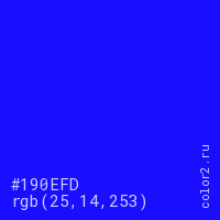 Цвет #190EFD в цветовой модели RGB обозначается тремя октетами (25, 14, 253) в десятичном формате и #190EFD в шестнадцатиричном (hex) формате, которые являются интенсивностью красного 25 (hex 19), интенсивность зелёного 14 (hex 0E) и интенсивность синего 253 (hex FD).