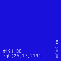 Цвет #1911DB в цветовой модели RGB обозначается тремя октетами (25, 17, 219) в десятичном формате и #1911DB в шестнадцатиричном (hex) формате, которые являются интенсивностью красного 25 (hex 19), интенсивность зелёного 17 (hex 11) и интенсивность синего 219 (hex DB).