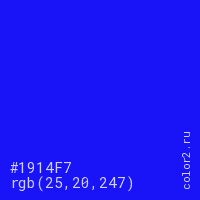 Цвет #1914F7 в цветовой модели RGB обозначается тремя октетами (25, 20, 247) в десятичном формате и #1914F7 в шестнадцатиричном (hex) формате, которые являются интенсивностью красного 25 (hex 19), интенсивность зелёного 20 (hex 14) и интенсивность синего 247 (hex F7).