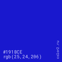 Цвет #1918CE в цветовой модели RGB обозначается тремя октетами (25, 24, 206) в десятичном формате и #1918CE в шестнадцатиричном (hex) формате, которые являются интенсивностью красного 25 (hex 19), интенсивность зелёного 24 (hex 18) и интенсивность синего 206 (hex CE).