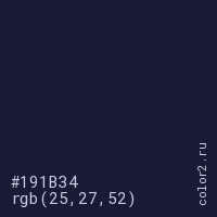 Цвет #191B34 в цветовой модели RGB обозначается тремя октетами (25, 27, 52) в десятичном формате и #191B34 в шестнадцатиричном (hex) формате, которые являются интенсивностью красного 25 (hex 19), интенсивность зелёного 27 (hex 1B) и интенсивность синего 52 (hex 34).