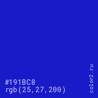 Цвет #191BC8 в цветовой модели RGB обозначается тремя октетами (25, 27, 200) в десятичном формате и #191BC8 в шестнадцатиричном (hex) формате, которые являются интенсивностью красного 25 (hex 19), интенсивность зелёного 27 (hex 1B) и интенсивность синего 200 (hex C8).