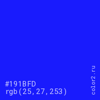 Цвет #191BFD в цветовой модели RGB обозначается тремя октетами (25, 27, 253) в десятичном формате и #191BFD в шестнадцатиричном (hex) формате, которые являются интенсивностью красного 25 (hex 19), интенсивность зелёного 27 (hex 1B) и интенсивность синего 253 (hex FD).