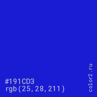 Цвет #191CD3 в цветовой модели RGB обозначается тремя октетами (25, 28, 211) в десятичном формате и #191CD3 в шестнадцатиричном (hex) формате, которые являются интенсивностью красного 25 (hex 19), интенсивность зелёного 28 (hex 1C) и интенсивность синего 211 (hex D3).