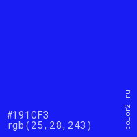 Цвет #191CF3 в цветовой модели RGB обозначается тремя октетами (25, 28, 243) в десятичном формате и #191CF3 в шестнадцатиричном (hex) формате, которые являются интенсивностью красного 25 (hex 19), интенсивность зелёного 28 (hex 1C) и интенсивность синего 243 (hex F3).