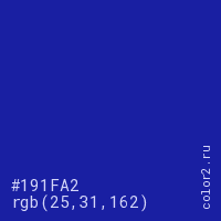 Цвет #191FA2 в цветовой модели RGB обозначается тремя октетами (25, 31, 162) в десятичном формате и #191FA2 в шестнадцатиричном (hex) формате, которые являются интенсивностью красного 25 (hex 19), интенсивность зелёного 31 (hex 1F) и интенсивность синего 162 (hex A2).