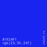 Цвет #1924F1 в цветовой модели RGB обозначается тремя октетами (25, 36, 241) в десятичном формате и #1924F1 в шестнадцатиричном (hex) формате, которые являются интенсивностью красного 25 (hex 19), интенсивность зелёного 36 (hex 24) и интенсивность синего 241 (hex F1).