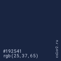 Цвет #192541 в цветовой модели RGB обозначается тремя октетами (25, 37, 65) в десятичном формате и #192541 в шестнадцатиричном (hex) формате, которые являются интенсивностью красного 25 (hex 19), интенсивность зелёного 37 (hex 25) и интенсивность синего 65 (hex 41).