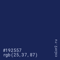 Цвет #192557 в цветовой модели RGB обозначается тремя октетами (25, 37, 87) в десятичном формате и #192557 в шестнадцатиричном (hex) формате, которые являются интенсивностью красного 25 (hex 19), интенсивность зелёного 37 (hex 25) и интенсивность синего 87 (hex 57).