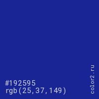 Цвет #192595 в цветовой модели RGB обозначается тремя октетами (25, 37, 149) в десятичном формате и #192595 в шестнадцатиричном (hex) формате, которые являются интенсивностью красного 25 (hex 19), интенсивность зелёного 37 (hex 25) и интенсивность синего 149 (hex 95).