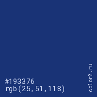Цвет #193376 в цветовой модели RGB обозначается тремя октетами (25, 51, 118) в десятичном формате и #193376 в шестнадцатиричном (hex) формате, которые являются интенсивностью красного 25 (hex 19), интенсивность зелёного 51 (hex 33) и интенсивность синего 118 (hex 76).
