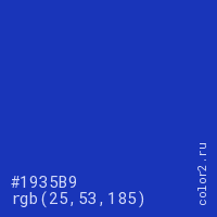 Цвет #1935B9 в цветовой модели RGB обозначается тремя октетами (25, 53, 185) в десятичном формате и #1935B9 в шестнадцатиричном (hex) формате, которые являются интенсивностью красного 25 (hex 19), интенсивность зелёного 53 (hex 35) и интенсивность синего 185 (hex B9).