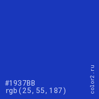 Цвет #1937BB в цветовой модели RGB обозначается тремя октетами (25, 55, 187) в десятичном формате и #1937BB в шестнадцатиричном (hex) формате, которые являются интенсивностью красного 25 (hex 19), интенсивность зелёного 55 (hex 37) и интенсивность синего 187 (hex BB).