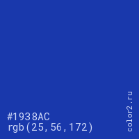 Цвет #1938AC в цветовой модели RGB обозначается тремя октетами (25, 56, 172) в десятичном формате и #1938AC в шестнадцатиричном (hex) формате, которые являются интенсивностью красного 25 (hex 19), интенсивность зелёного 56 (hex 38) и интенсивность синего 172 (hex AC).