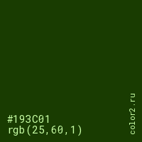 Цвет #193C01 в цветовой модели RGB обозначается тремя октетами (25, 60, 1) в десятичном формате и #193C01 в шестнадцатиричном (hex) формате, которые являются интенсивностью красного 25 (hex 19), интенсивность зелёного 60 (hex 3C) и интенсивность синего 1 (hex 01).