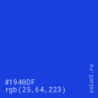 Цвет #1940DF в цветовой модели RGB обозначается тремя октетами (25, 64, 223) в десятичном формате и #1940DF в шестнадцатиричном (hex) формате, которые являются интенсивностью красного 25 (hex 19), интенсивность зелёного 64 (hex 40) и интенсивность синего 223 (hex DF).