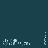 Цвет #19414B в цветовой модели RGB обозначается тремя октетами (25, 65, 75) в десятичном формате и #19414B в шестнадцатиричном (hex) формате, которые являются интенсивностью красного 25 (hex 19), интенсивность зелёного 65 (hex 41) и интенсивность синего 75 (hex 4B).