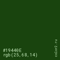 Цвет #19440E в цветовой модели RGB обозначается тремя октетами (25, 68, 14) в десятичном формате и #19440E в шестнадцатиричном (hex) формате, которые являются интенсивностью красного 25 (hex 19), интенсивность зелёного 68 (hex 44) и интенсивность синего 14 (hex 0E).