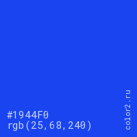 Цвет #1944F0 в цветовой модели RGB обозначается тремя октетами (25, 68, 240) в десятичном формате и #1944F0 в шестнадцатиричном (hex) формате, которые являются интенсивностью красного 25 (hex 19), интенсивность зелёного 68 (hex 44) и интенсивность синего 240 (hex F0).