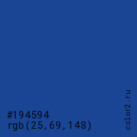 Цвет #194594 в цветовой модели RGB обозначается тремя октетами (25, 69, 148) в десятичном формате и #194594 в шестнадцатиричном (hex) формате, которые являются интенсивностью красного 25 (hex 19), интенсивность зелёного 69 (hex 45) и интенсивность синего 148 (hex 94).